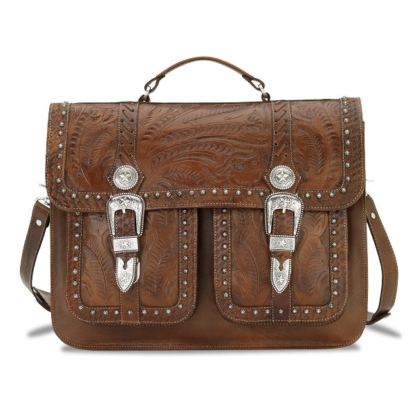 Two compartment briefcase with two front pouches and back zipper pocket. Inside has zipper pocket and organizer pouches. Briefcase includes adjustable/detachable shoulder strap. Snap closure on both pockets. Hand tooled vegetable tanned antique brown leather decorated with antiqued silver spots, leather lacing, and silver star buckle sets and conchos. Each piece is made by hand, one at a time. This item is backed by the American West Lifetime Guarantee